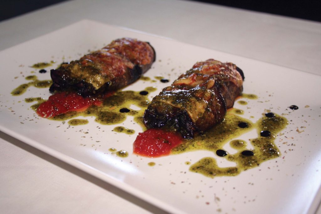 Cannelloni af aubergine med stuvet spinat, pesto og tomatmarmelade