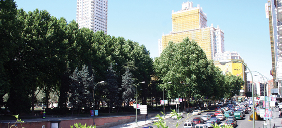 Her ligger to af byens mest emblematiske bygninger, Torre de Madrid (t.v.) og Edificio España.
