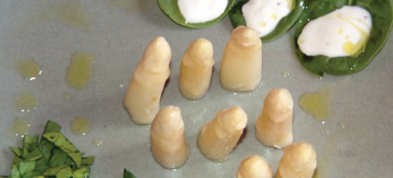 Navarra-folkene har en forkærlighed for asparges. De serveres som en tapa eller en forret, som her med mouselline-sauce og spinat, eller med røget laks, kaviar eller blot en skefuld mayonnaise.