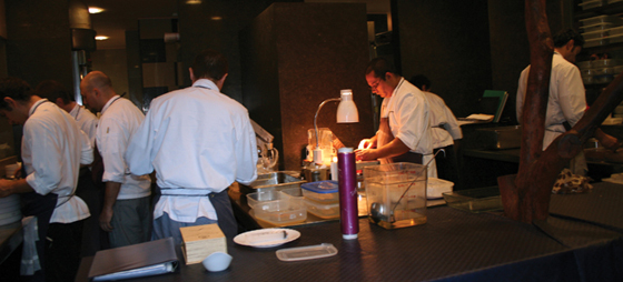 Jeg inviteres med ned til køkkenet. Om en time forventes gæsternes ankomst, og de første aperitiffer skal være klare, og det skal snart også de øvrige mange molekylære – eller El Bulli kreationer. De ca. 40 kokke er koncentrerede, og deres arbejde virker som en mellemting mellem et samlebånd og en myretue. Ferran Adrià lader til at lave ingenting og er alligevel med i alt, hvad der foregår.