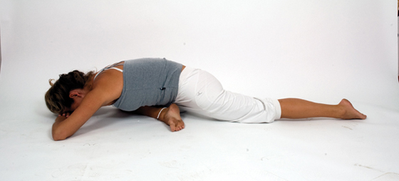 Sådan gør du: Stå på alle fire. Kryds højre ben ind over venstre, så højre knæ peger fremad. Ånd ud, og lad venstre ben glide tilbage, så venstre lyske kommer ned mod højre hæl. I en udånding læner du dig forover og hviler arme og pande i gulvet. Giv slip i lysken.