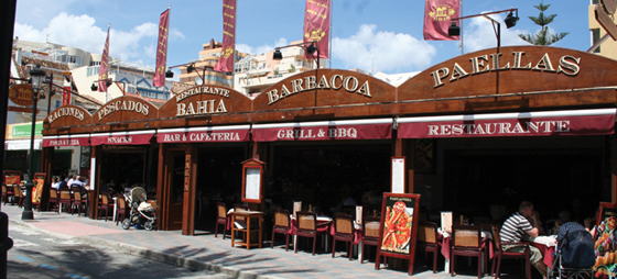 Restaurante Bahía har i dag plads til 200 gæster, hvoraf halvdelen af pladserne er på den hyggelige, overdækkede terrasse, hvorfra man kan nyde strandpromenaden på afstand og se de forbipasserende lide i solen, mens man selv sidder i skyggen og nyder sin mad. Og hvad angår at nyde sin mad, er Restaurante Bahía nok en af de få restauranter ved strandpromenaden, der kan flotte sig med et menukort, hvorpå der er noget til alle smagsløg og aldersgrupper. Menukortet, der også findes i en dansk udgave, er så omfattende, at det kan være svært at tage en beslutning uden først at have ombestemt sig et par gange. Hovedretterne består ikke, som man ofte er vant til, af et par fiskeretter og to forskellige varianter af solomillo (mørbrad), samt lidt kylling. På Restaurante Bahía kan man nyde alle spanske fiskearter, skaldyr samt paella, og den altid populære lenguado (søtunge) tilberedes enten a la plancha eller a la parilla med mange forskellige slags tilbehør og saucer. Det samme gælder mørbraden, der ikke bare findes i varianterne okse eller svin, men som søtungen også tilberedes a la plancha eller la parilla eller som barbecue med valget mellem et utal af grøntsager og saucer.