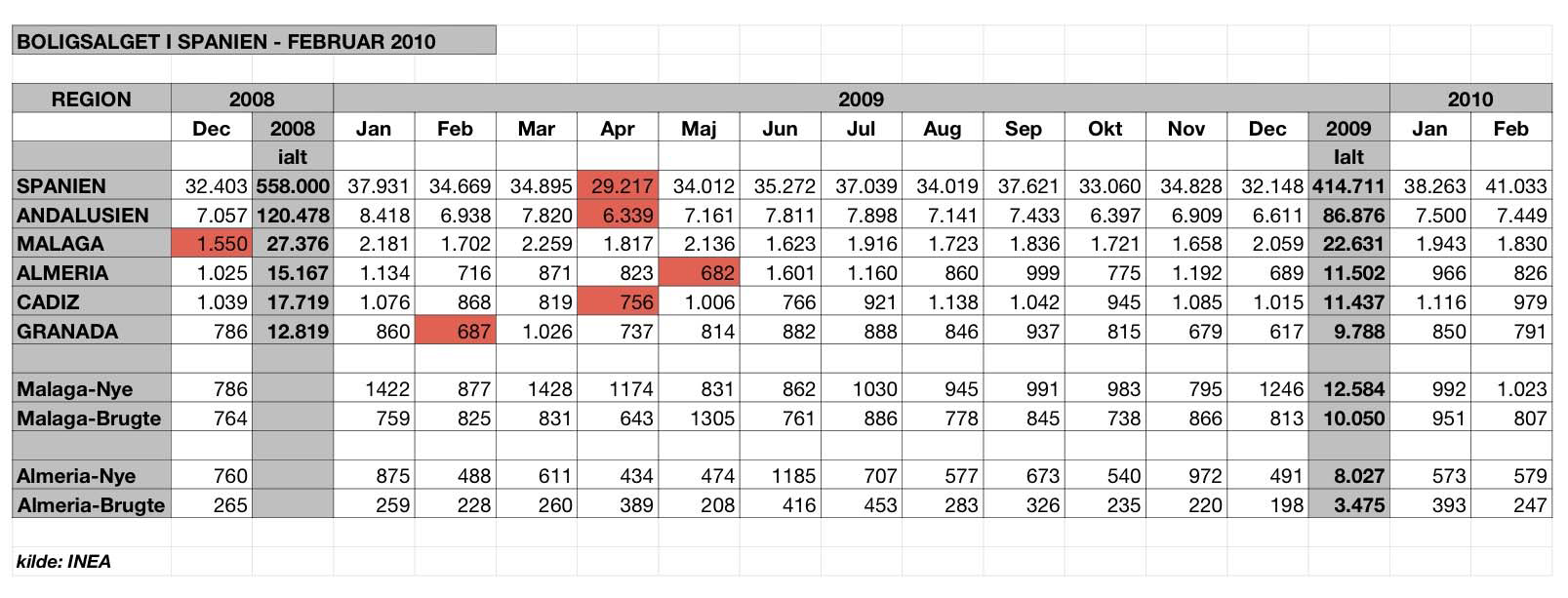 Hvis vi tager de sidste først, altså salgstallene, så blev der i Spanien, i hele 2009, solgt 414.711 boliger (nye og brugte). Tallet for 2008 var 558.000, altså et fald i 2009 på 25,7 %.