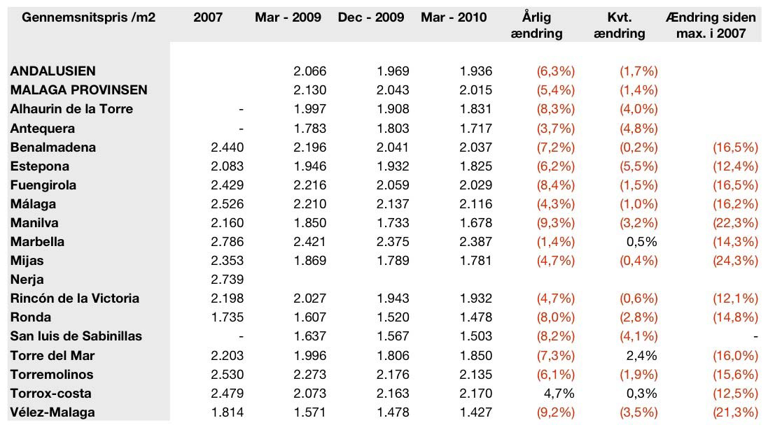 Med nogle få undtagelser er der tale om fald i priserne på årsbasis mellem 1,4% (Marbella) og 9,3% (Manilva). Begge tallene er næppe overraskende, da det historisk har vist sig, at Marbella i krisetider holder sig bedst, mens det for Manilvas vedkommende formentlig skyldes de meget store, usolgte nybyggerier, der vil tage år at få realiseret.