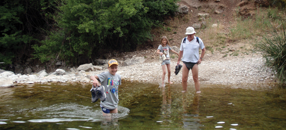 Stien fører naturligvis ned til floden og nu skal vi over. Det foregår ved at vi smider sko og strømper og vader ud i det iskolde vand. Stenene på bunden er glatte, så mere end én glider og ryger i til halsen. Men det er en god og hurtig måde at blive afkølet på. Mens vi står på bredden plaskvåde og lufttørrer, får vi beskæmmede øje på den meget fine bro, der er bygget ca. 100 m. længere oppe ad floden. Øh… den havde vi lige overset. Så, man skal gå til venstre, når man kommer ned til floden, for så vil en sti føre én lige hen til broen.