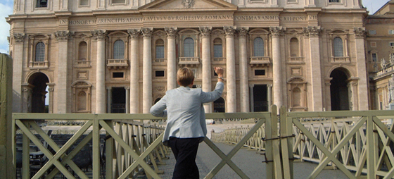 La Danesas Jette Christiansen banker forgæves på en imaginær dør til Vatikanet.