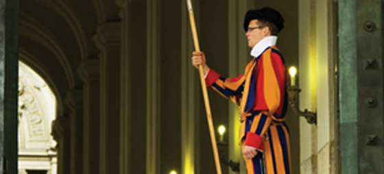 110 schweizergardister, der er iberegnet statens indbyggertal, er pavens livvagter og Vatikanets eneste militær.