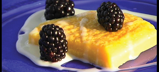 Vend det Himmelske Flæsk ud af formen, fordel den på fire tallerkner og pynt med lidt bær og eventuelt en skefuld yoghurt eller is.