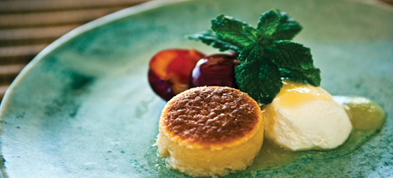 Blommesoufflé: Blommesoufflé med syltede blommer og vanillecreme