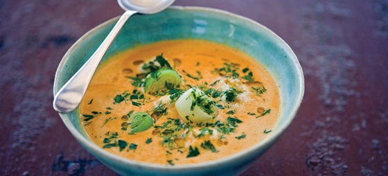 Gulerods- og porresuppe: Gulerods- og porresuppe med appelsin, chilli, koriander og fiskeboller
