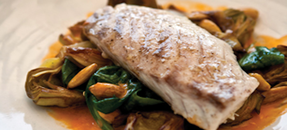 Stegt Corvina: Stegt Corvina med artiskokker, mandler og spinat