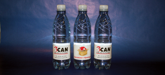 På første billede ses Scan Transports specialproducerede vandflasker. Det andet afslører to norske golflandsholdsspillere efter sejren på Atalaya Golf, som bedømt på smilene er ualmindeligt godt tilfredse med vandets smag. I baggrunden ses i øvrigt Britt fra Scan Transport.