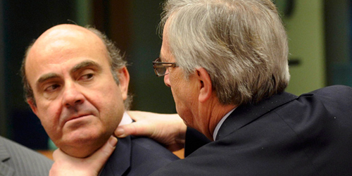 Chefen for Euro-gruppen, Jean-Claude Juncker, tager kvælertag på Spaniens finansminister, Luis de Guindos, der skal finde 23 milliarder euro til Bankia.
