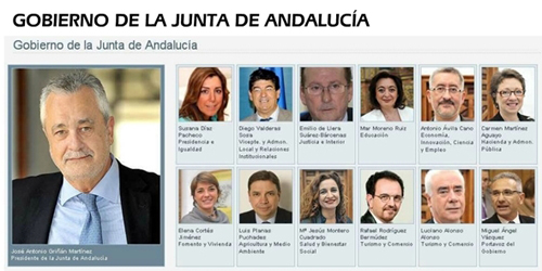 Formand José Antonio Griñán med de øvrige medlemmer af den nye lokalregering: Susana Díaz, Diego Valderas, Emilio de Llera, Mar Moreno, Antonio Ávila, Carmen Martínez, Elena Cortés, Luis Planas, María Jesús Montero, Rafael Rodríguez Luciano Alonso og talsmand Miguel Ángel Vázquez.