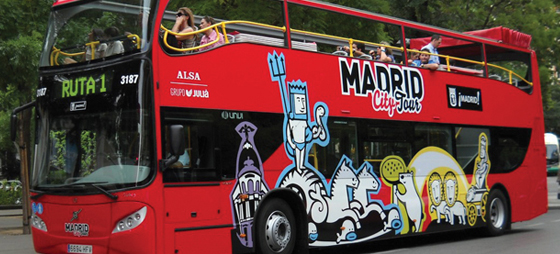 Efter at være blevet indlogeret på hotellet (og efter at have skiftet bukser) begiver jeg mig tilbage i Madrids gader. Her beslutter jeg at købe en todagsbillet til byens hop-af-hop-på-busser, og lad det være sagt med det samme: de røde dobbeltdækkere er en fuldstændig fantastisk og fleksibel måde at se Madrid på. I to ruter, en historisk og en moderne, kører de flere gange i timen rundt til byens vigtigste seværdigheder, som du kan hoppe af og besøge efter behov. Når lysten er stillet, står du bare på igen og kører videre til næste attraktion. I bussen får du desuden udleveret et par høretelefoner, som du kan stikke i den radio, der hører til hvert sæde. Her fortæller en stemme på dit foretrukne af 14 sprog om det, man passerer, ligesom en turistguide står klar til at svare på spørgsmål. Alt i alt er de såkaldte panoramabusser, tidligere Madrid Vision, en suveræn måde at få dannet sig et overblik over Madrid på.