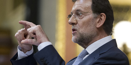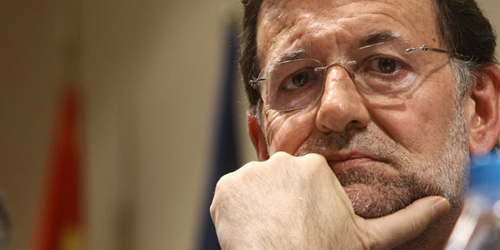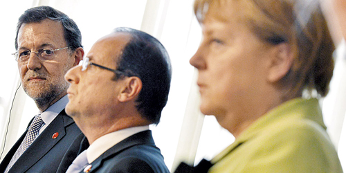 Statsminister Mariano Rajoy kigger forbi Frankrigs François Hollande mod Tysklands Angela Merkel for at finde vejen ud af krisen.