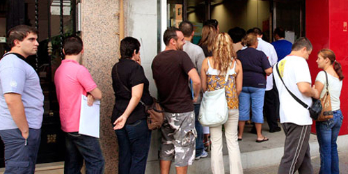 Unge står i kø ved arbejdsformidlingen, Oficina de Empleo.