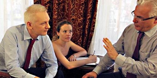 Julian Assange (t.v.) mødtes efter sin pressekonference søndag med sin advokat, spanske Baltasar Garzón.