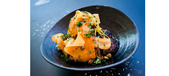 Ved servering krydres kødet og steges hårdt på hver side, så der kommer stegeskorpe, men stadig er medium-rare. Skær i strimler ved servering.