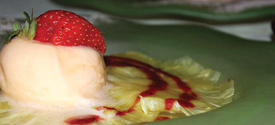 Til dessert fik vi en ananas-carpacchio med mandarinsorbet, dekoreret med friske jordbær og hindbærpure, og let sprøjtet med cointreau.