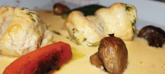 Bagefter var det fiskens tur. Flot præsenteret fik vi en tallerken med søtunge fyldt med delikate kammuslinger serveret med en lækker hummerflødesauce og sprøde grøntsager. Den valgte vin hertil var fra Galicien fra D.O Rias Baixas og lavet på druen Albariño. Med sin fine og sarte farve og bouquet med frisk syrlighed, duft af citrus, abrikos og fersken, virkede den som perfekt kompagnon, som ligeledes kunne have passet til frugtsalaten.
