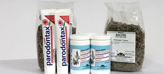 Salvie-kapsler, salvie-te og tandpastaen Parodontax kan fås i Vitamina i Centro Idea.