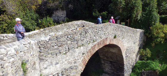 Ruten går igennem de bølgende marker, olivenlunde og krat, der ligger nord for Viñuela søen. Af og til er stien meget smattet, men det har jo regnet en del, så det tager vi med sindsro. Der er meget flotte kig ind imod Maromas skørter mod øst – vi er stadig langt væk fra majestæten, men han ligger tålmodigt og venter. Til højre kan vi se at Viñuela søen er propfuld af al den regn, der faldt i efteråret, så tørketruslen er afblæst. Vi nyder denne lette vandring, for der er ikke alt for mange højdemeter, at overvinde. Faktisk går det mere eller mindre lige ud og nedad det meste af tiden. På et tidspunkt krydser vi hovedvejen A 402 fra Vélez til Alhama, og nu går det stærkt nedad, helt til vi kommer til floden Río Velez, der starter oppe ved Ventas de Zafarraya og løber forbi byen Vélez. Her bruser floden afsted og er ikke sådan at vade over, men heldigvis er der opsat et skilt, der viser hen til den fine bro, der er bygget her. Vel ovre broen må vi belave os på en stejl stigning op til Alcaucín.