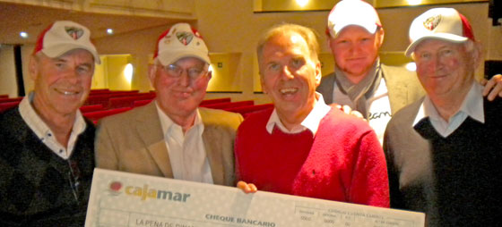 La Peña-medlemmerne John Jørgensen, Knud Nielsen, Allan Frank og Finn Stuer Lauridsen sammen med Jacob Haugaard med La Peña-checken til Cudeca.