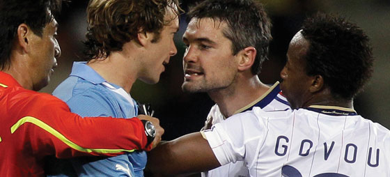 Efter kanonsalg fik Málaga CF glæde af det europæiske overskudslager De er ikke ligefrem venner på ovenstående foto, landsholdskaptajnen for Uruguay, Diego Lugano, og den franske midtbaneslider Jérémy Toulalan. Billedet er taget ved slutrunden om verdensmesterskabet i fodbold i Sydafrika i 2010, hvor Uruguay og Frankrig spillede 0-0. En slutrunde, der endte i tumult og fiasko for Frankrig, hvorimod den sydamerikanske nation med færre indbyggere end Danmark nåede frem til semifinalerne, hvor de brutale hollændere spændte ben for Uruguay med en 3-2 sejr.