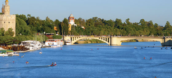 Den store flod, som maurerne døbte floden, har sin kilde i Sierra de Cazorla i Jaén-provinsen, og løber efter 578 km ud i Atlanterhavet ved Sanlúcar de Barrameda i Cádiz-provinsen. Undervejs passerer Guadalquivir, Sydspaniens største flod, Sevilla, hvor den her ses lunte forbi Det Gyldne Tårn.