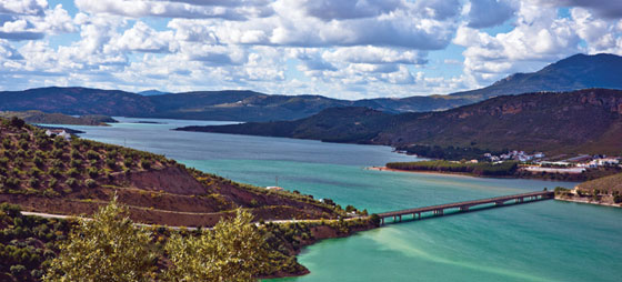 Genil har sin kilde i Pico Veleta i Sierra Nevada. Efter 337 km vælger den at løbe ud i en anden flod, nemlig Guadalquivir, hvilket sker ved Palma del Río i Córdoba-provinsen. Genil er den næst længste flod i Andalusien. På billedet ses en bro over vandreservoiret ved byen Iznajar, som forsynes af Genil.