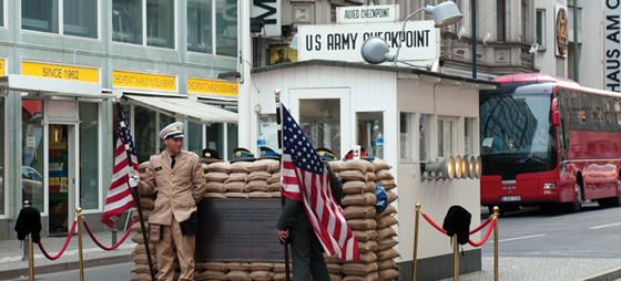Et af de kuriøse overgangssteder, hvor indbyggere med specielle visa, diplomater og udlændinge kunne krydse grænsen, er Checkpoint Charlie. Han står der stadigvæk.