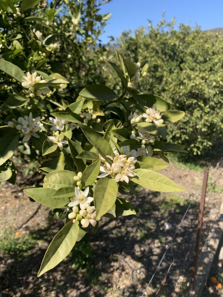 Inden længe tager ruten os ud af byen og nu starter appelsineventyret. Der står marker med appelsintræer på begge sider af vejen, og vi ser det særsyn, at træerne både bærer frugter og blomster. I april springer blomsterne ud, og ikke blot er de smukke at se på, de udsender en himmelsk duft. Det er en duft uden lige, uden sidestykke, ja den er himmelstormende skøn. Og så er synet af et appelsintræ med både frugter og blomster guf for øjnene, især når man har sneen i Sierra Nevada som baggrund. Så må man knibe sig i armen for at se, om man drømmer eller er vågen.