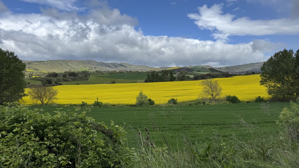 Vi kom ud af det hektiske byliv i Burgos, og var nu atter omgivet af den rå natur, bakker op og ned, og med ‘højt til loftet’. Roen brydes kun af en flok syngende franskmænd og et par danske søskende (i en moden alder) hvor broderen netop havde fået en ny hofte. Han havde købt en cykel og fulgte nu søsteren på sidelinjen. Dejligt livsbekræftende.