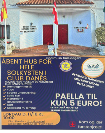 I forrige månedsbrev omtalte jeg et af vores store kommende arrangementer, – Åbent Hus den 11. oktober. Her skal alle vores aktiviteter kunne demonstreres. Der kommer et hold, som er samarbejdspartnere til Jens Erik Gylling i foreningen, der laver bl.a. bocadillos til nødlidende. Dette hold laver en stor portion paella, som vil blive solgt til 5 € per portion. Derudover er køkkenet også åbent. Drikkevarer skal købes i baren. Samme hold planlægger også med et foredrag. Og en petanque-klub – Club Danes de Petanque – fra Torre del Mar vil komme med 25-30 spillere og udfordre os i denne disciplin, så vi skal have etableret yderligere petanque-baner til dagen.