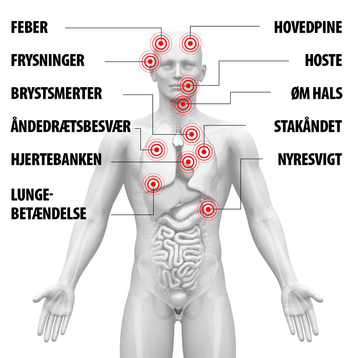 Den nye coronavirus kan også forårsage luftvejsinfektion hos mennesker. De fleste inficerede får en mild luftvejsinfektion. Et mindretal får lungebetændelse. Risikoen for at dø af lungesvigt udløst af virussen antages at være mindre end én procent.