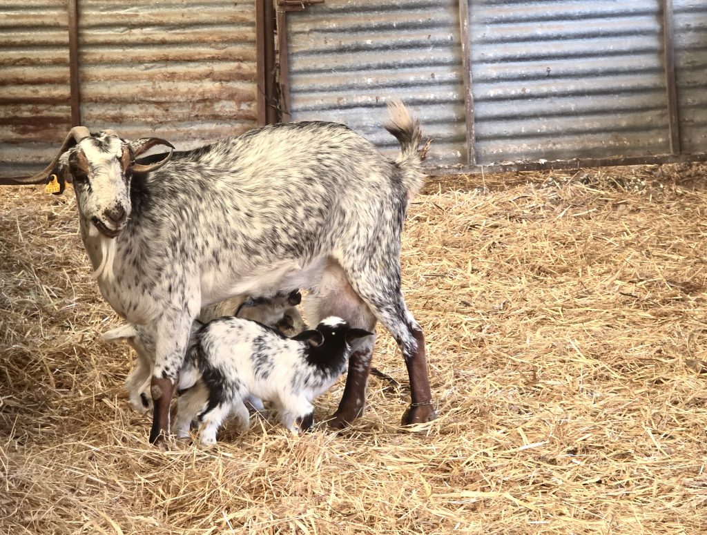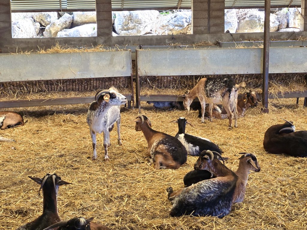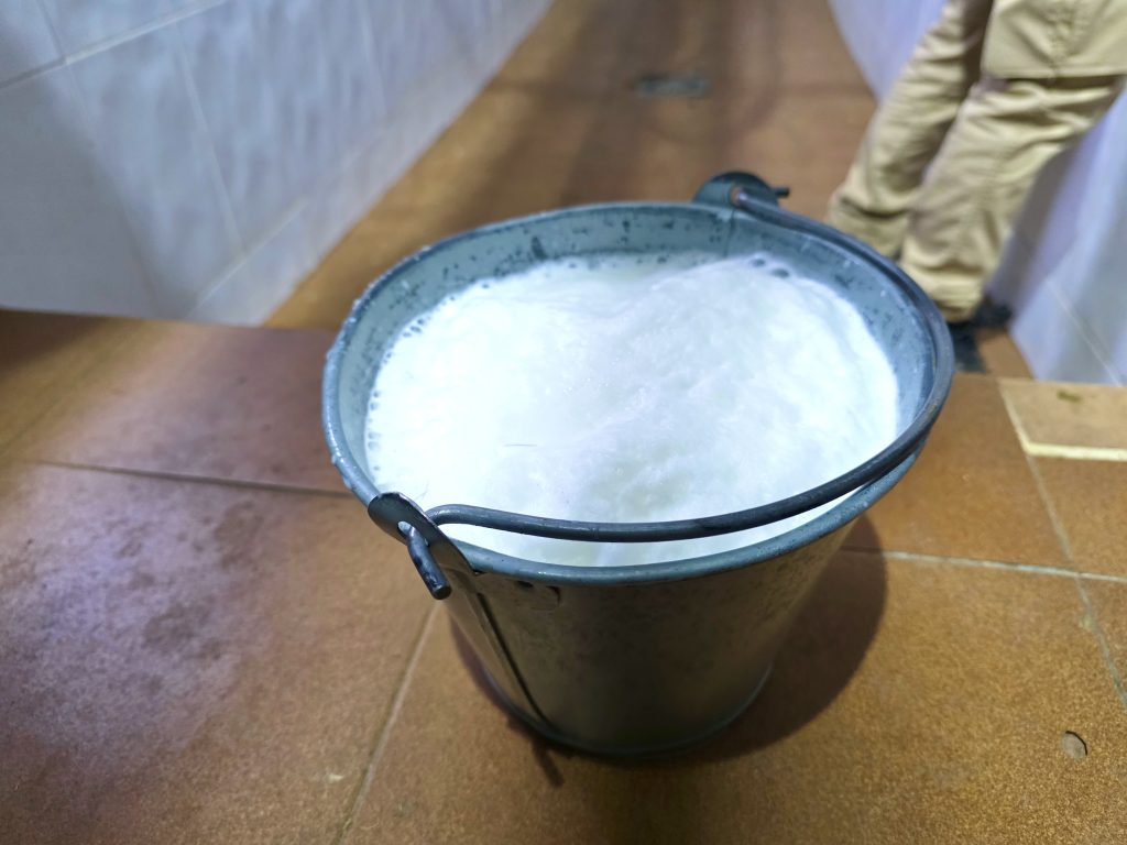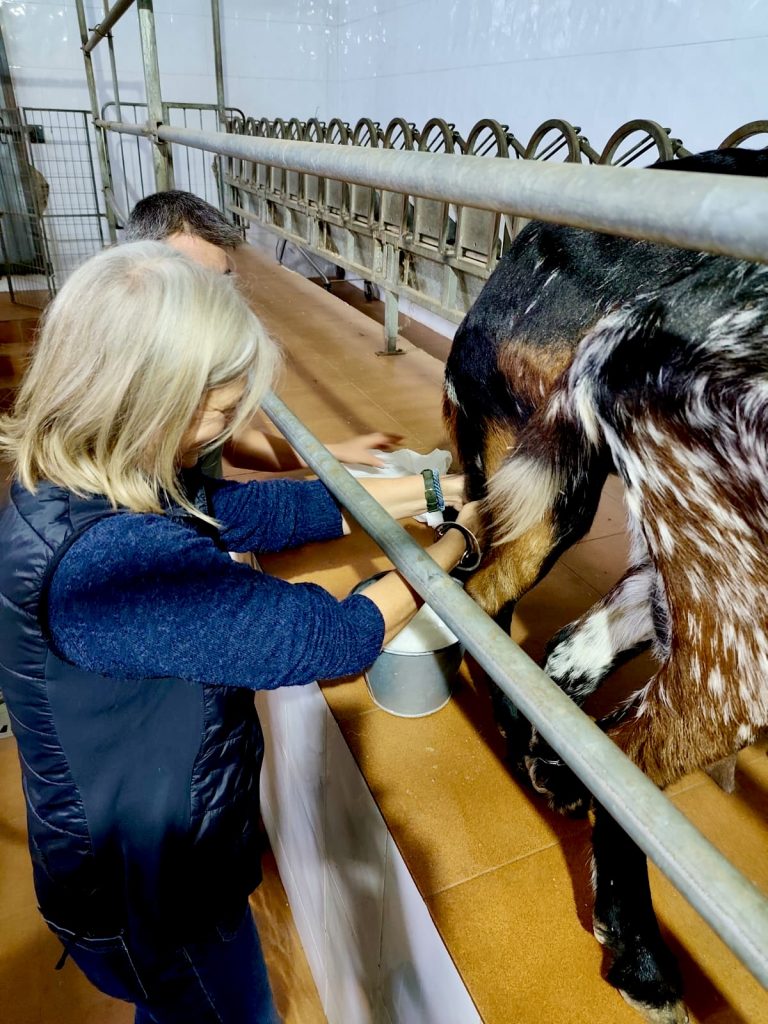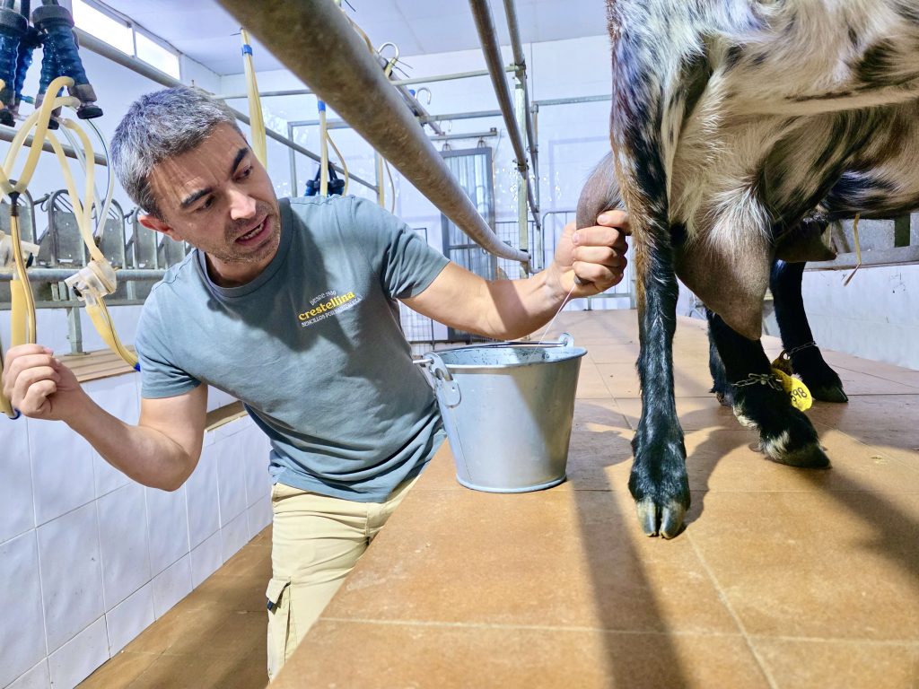 Vores første stop er malkestationen, hvor to villige geder stiller sig til rådighed – så længe de har mad foran sig. Juan demonstrerer teknikken for os, og mælken sprøjter ned i den klassiske zinkspand, selv om de til daglig bruger malkemaskiner af hygiejniske hensyn.