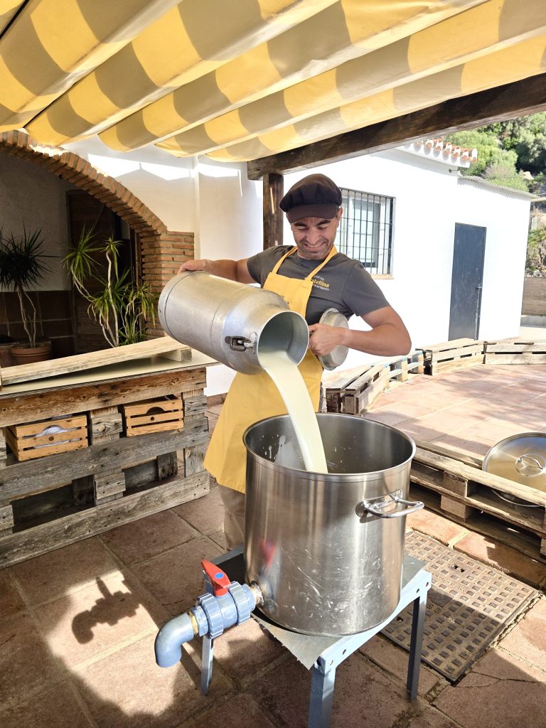 Efter at have hørt historien om gården, begynder „arbejdet“. Vi skal nemlig lave en friskost af gedemælk, mens vi er her. Juan hælder to store spande mælk i en tempereret beholder og forklarer processen, mens han forsigtigt tilsætter løben. Nogen spørger, hvor meget gedemælk de producerer, og vi lærer hurtigt, at når det handler om økologisk landbrug, er svaret altid: „Depende de …“ (Det kommer an på).