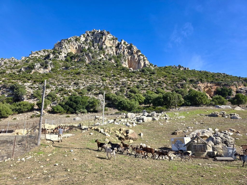 Herfra går turen ind i et stort, åbent rum, hvor de fritgående geder opholder sig, når de ikke er ude. Som dagens hyrder hjælper vi Juan med at samle dyrene, før de skal ud på græs. Det kræver lidt manøvrering, for de to gamle bukke kan ikke være sammen, så dyrene slippes ud på bjerget i to flokke, hver med sin alfahan. Men det er her, på bjerget sammen med gederne, at Juan trives bedst.