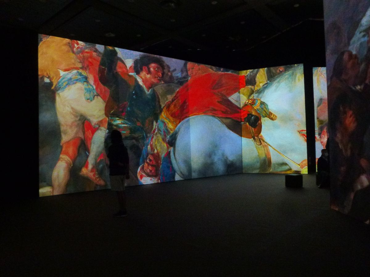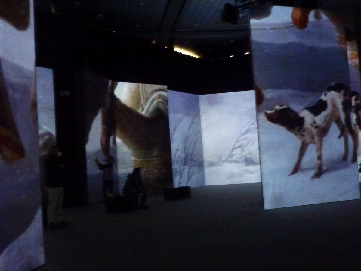 Efter ca. 1 kvarter i det didaktiske rum bliver man lukket ind i `the show room`, hvor der er anbragt nogle skamler her og der og på væggene er der store skærme. Der er skamler til alle, men de fleste går rundt i rummet mens showet kører. Nu vises det samme maleri på en masse forskellige skærme hele vejen rundt og inde i midten af rummet. Man bliver med andre ord omringet og beskudt fra alle sider af billedet mens flot musik lyder. Meget af musikken var af Manuel de Falla, men vi mener også vi hørte noget af Grieg. Flot var det i hvert fald.
