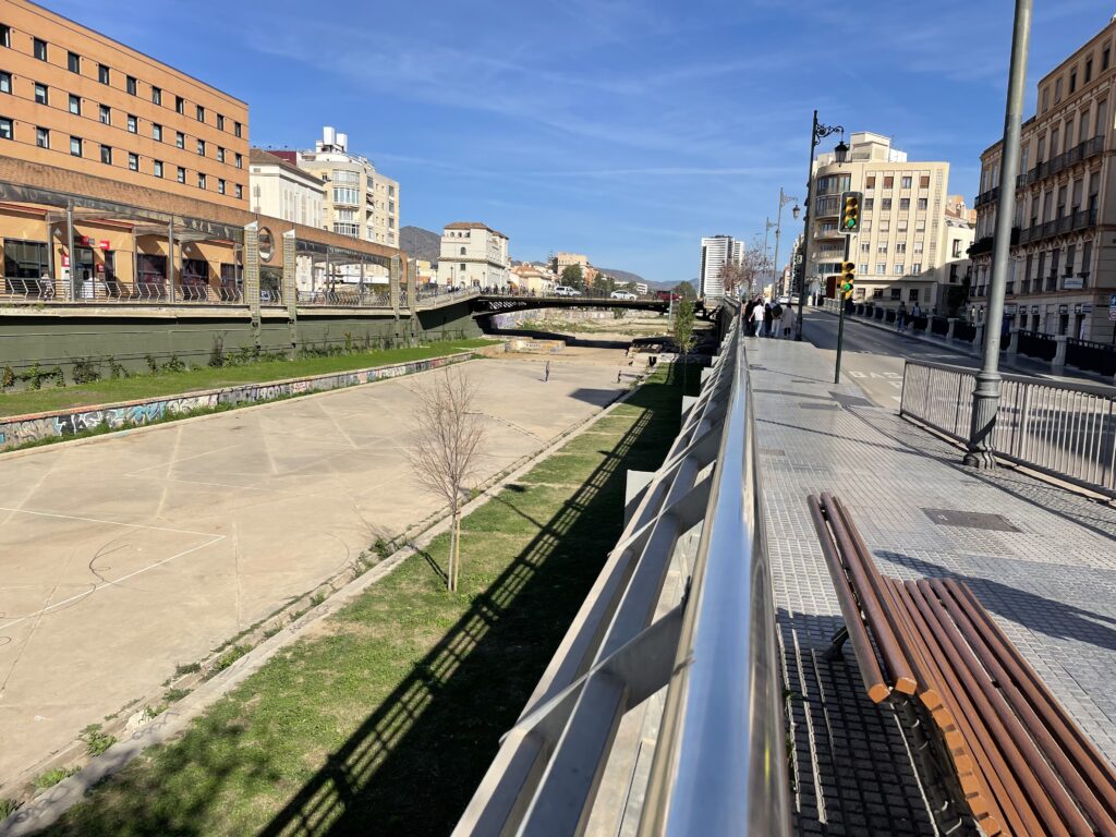 Da floden jo ligger lige midt i byen, parkerede vi på Parking Marina, som ligger i den vestlige ende af Muelle uno. Nede i P-kælderen kan man se ruiner af Málagas gamle havnefront fra romertiden. Da gik vandet højere op end i dag. Når man kommer op fra P- kælderen ad trappen bagest i kælderen går man blot hen ad Alameda i vestlig retning, indtil man kommer til floden, som ligger lige inden man kommer til El Corte Inglés.