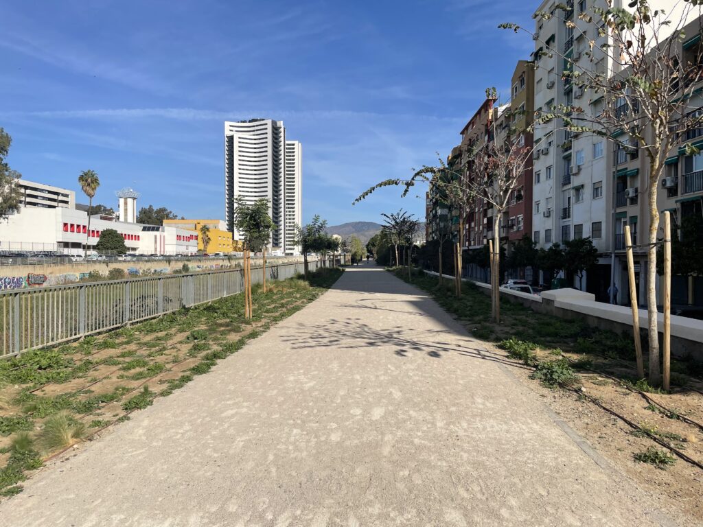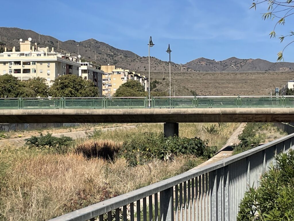 Da vi atter står ude på gaden, fortsætter vi opad på fortovet, der løber langs med floden og undrer os over, hvor den nye sti bliver af. Men efter broen Puente de Armiñán forkynder et stort skilt, at vi er ved den nye sti. Der er anlagt 3 km. sti på flodens venstre side og 1,8 km. sti på den højre side, idet en flods sider bestemmes ved, at man står med ryggen til udspringet. Dermed er venstre side den østlige. Stien er angiveligt bygget for at give ´los malagueños´ en stærkt tiltrængt mulighed for at dyrke motion i form af vandring og løb på disse nye 4,8 km.