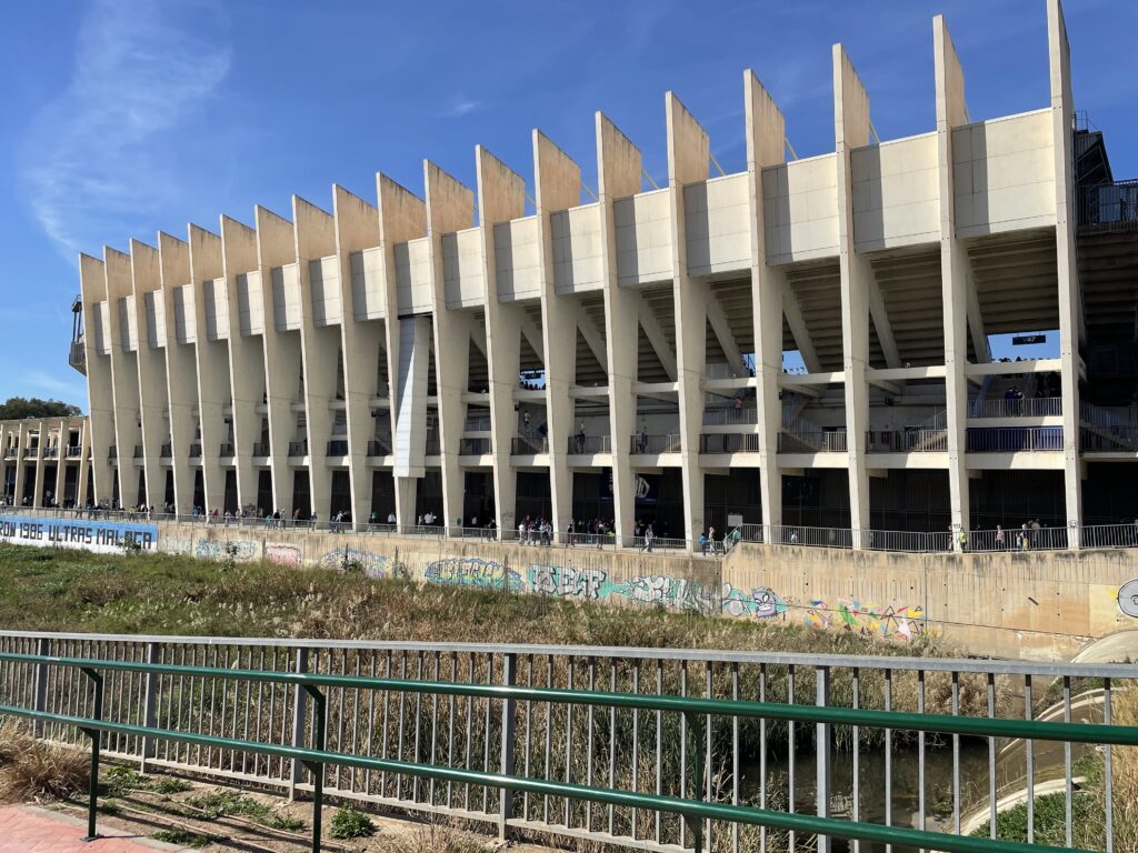 Vi strækker godt ud, og inden længe står vi overfor Malagas fodboldstadium La Rosaleda, som vi ofte har hørt om men aldrig set på tæt hold. Der er en vældig kommen og gåen ind til stadium, og det viser sig, at på denne søndag spiller Malaga FC kamp mod Huelvas hold: Recreativo de Huelva. Idet vi går forbi skal kampen til at begynde, og der er hujen og tilråb inde fra stadion. Festligt ser det ud til at gå for sig.