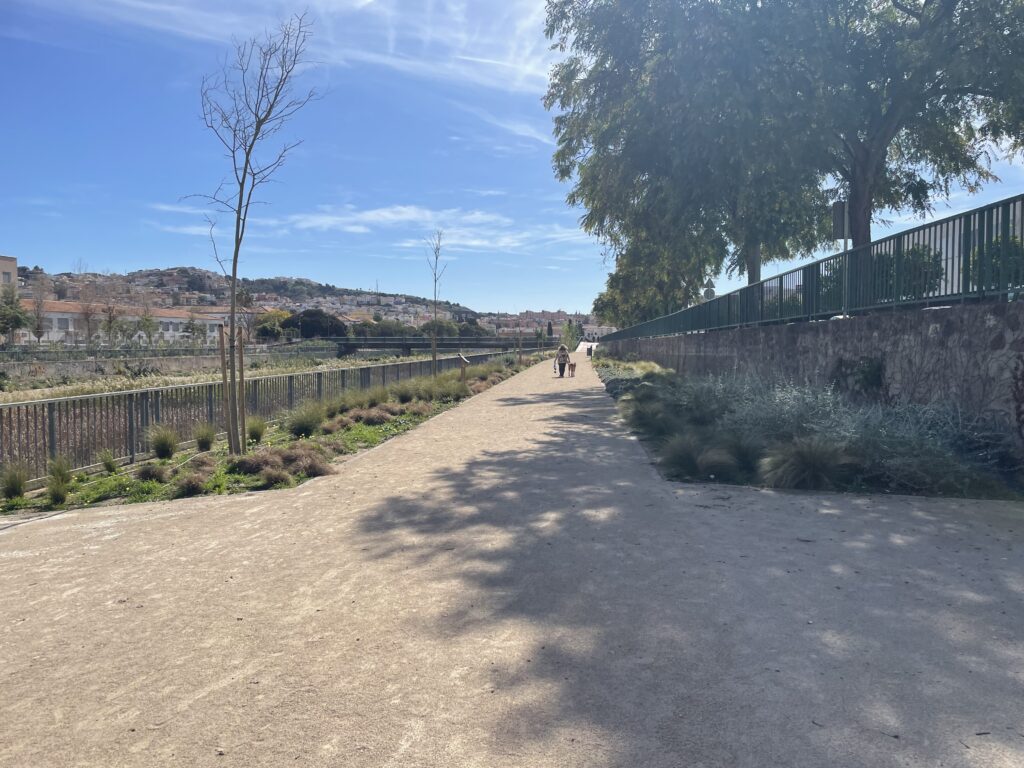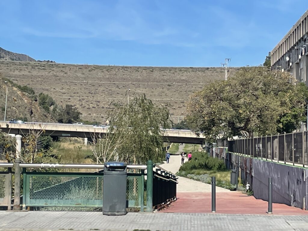 Vi fortsætter mod nord forbi Ciudad Jardin, som vi har set skilte til fra motorvejen, men aldrig set tæt på. Der er anlagt fine haveanlæg langs med floden, så det ser sympatisk ud. Inden længe passerer vi kvarteret med navnet La Sagrada Familia, men det er blot et boligkvarter, så vi skal ikke forvente at se nogen overdådig kirke her.