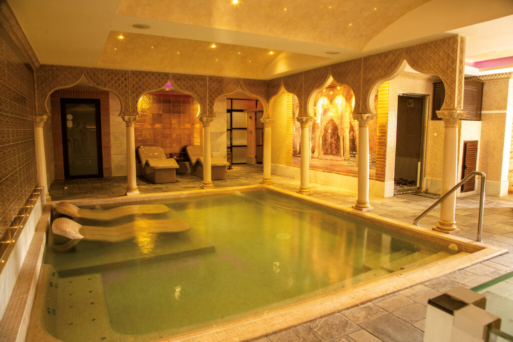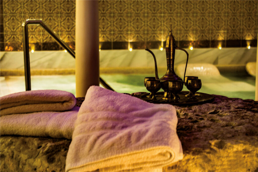 Du bliver mødt med bløde badekåber, tykke håndklæder og spa-sandaler, og alle produkter er økologiske og velduftende. I det centrale rum med en stor varm pool kan du flyde og kigge op på de stjerneformede huller i loftet, omgivet af arabiske toner, blafrende stearinlys og en beroligende varm tåge, som betyder, at du aldrig føler dig overvældet af andre gæster.