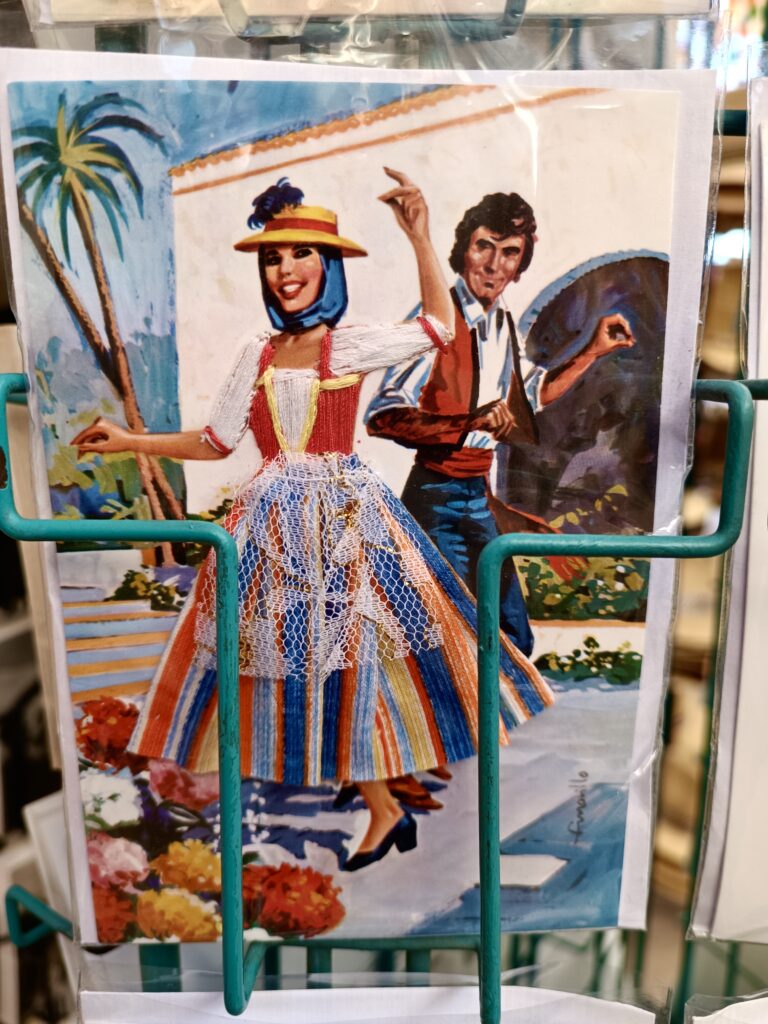 Alt, hvad jeg tjekkede, blev lavet i Kina/PRC, med undtagelse af keramik, hvor det ikke var helt klart, hvor det kom fra. Muligvis fra en fabrik i Spanien eller Marokko, men i hvert fald handlede det ikke længere om håndmalede ting. En af de få ting, som jeg fandt, og som stadig siges ikke kun at være designet og lavet i Spanien, er de klassiske postkort af en señora med en stofkjole, hvor nederdelen kan løftes op. Disse laves efter sigende stadig på De Kanariske Øer, og selvom de ikke er så detaljerede og fint broderede, som da jeg var barn, er de Hecho en España!