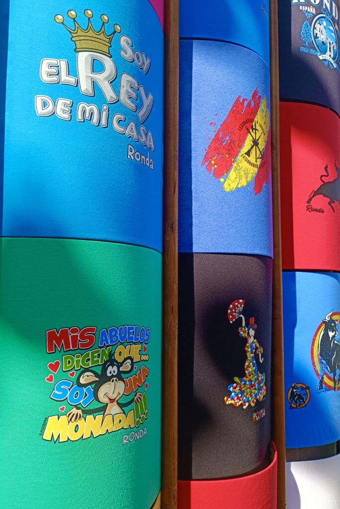 Da vi første gang besøgte vores nuværende hjemby Ronda for elleve år siden, var der færre souvenirbutikker end nu. De, der eksisterede, havde i det mindste et par kasser med gamle håndmalede antikke fliser, nogle hylder med groft og uraffineret keramik, der var lokalt fremstillet i la Serranía, og salatbestik af oliventræ, der var, hvis ikke lokalt, så i det mindste spansk-fremstillet. Men næsten alt dette er nu væk. Den sidste forretning, der solgte ægte spanske vifter i byen, forsvandt under pandemien. Nu er næsten alle de vifter, der sælges her, lavet i Asien, selvom nogle af de dyreste vil hævde, at de er designet i Spanien.
