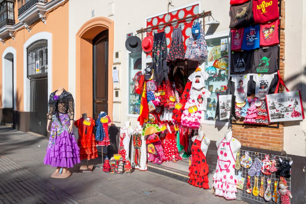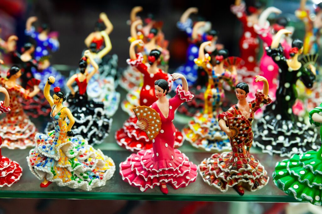 Du ser dem overalt. I enhver spansk by og shoppinggade ligger souvenirbutikker på rad og række. De har vægge fyldt med vifter, kilometervis af farverig spansk-inspireret keramik, statuer af tyre og spanske dansere, bakker med Alhambra-mønstre, kaffekopper og glasetuier med reproduktioner af Picassos kunst, forklæder og køkkenruller med Velasques verdensberømte kvindeskikkelser Las Meninas, trækastanjetter og plastik med og uden blomsterdekorationer og endda flamencokjoler, vel såkaldte flamencokjoler.