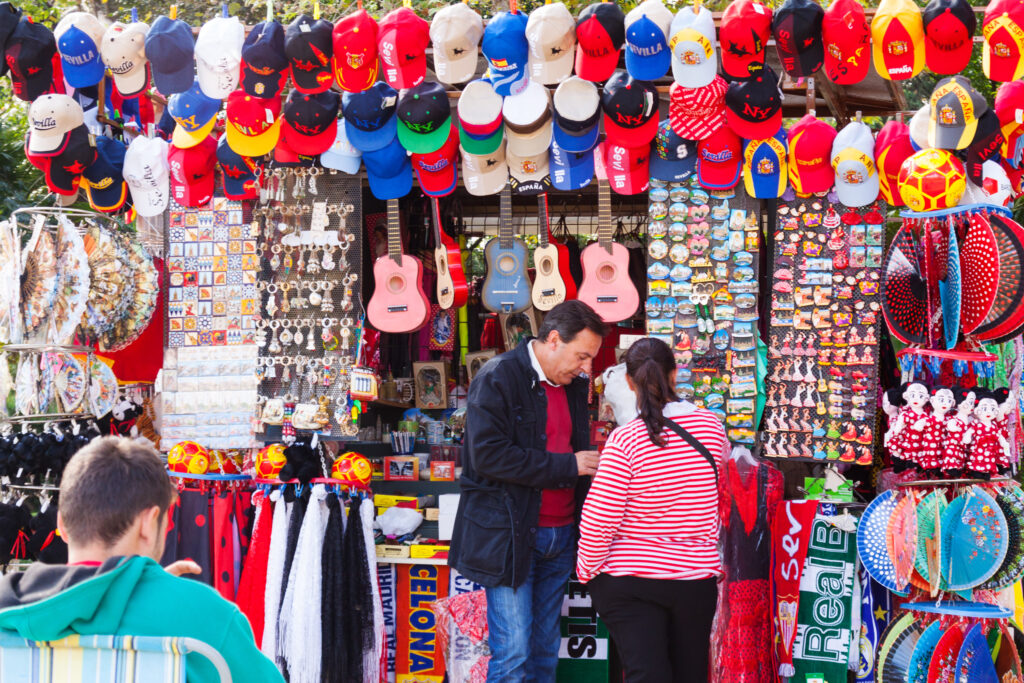 Ifølge El Mercado Global er Spaniens ti bedst sælgende souvenirs nu postkort, nøgleringe, magneter, vifter, T-shirts, kastanjetter, keramiske dekorative fingerbøl, dekorative små tallerkener, flamencokjoler og smykker. De fleste af disse er billige, farverige og næsten garanteret Hecho en PCR.
