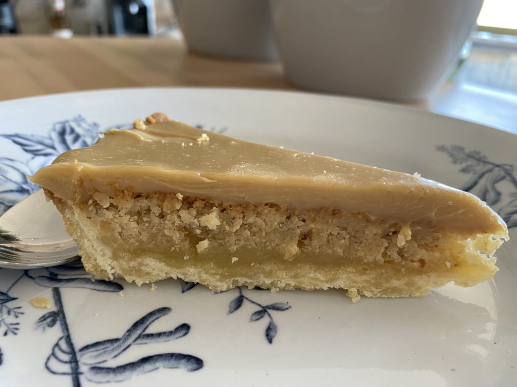 Kombinationen af hvid chokolade, kaffe og ristede hasselnødder er helt fantastisk. Denne tærte er lidt besværlig at lave på grund af de mange lag, men den er helt sikkert umagen værd. Den kan holde sig fint i køleskabet, så der er til flere dage.